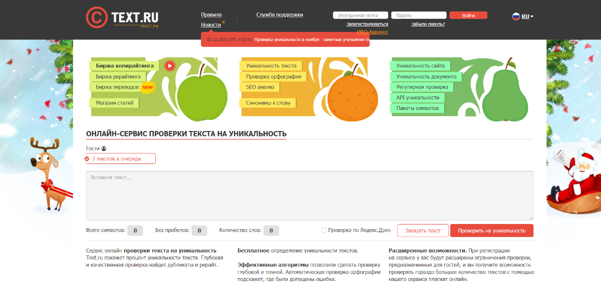 Второе место в рейтинге занимает сайт текст ру. Бесплатный доступ позволяет вносить проверки статьи размером не более 10 000 символом без пробелов. Приходится ждать очередь, преимущество программа отдает зарегистрированным пользователям. Чтобы быстро проверить большой объем работы, рекомендуется не покидать окно сайта. Так как в данный момент очередь может сбиться.