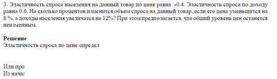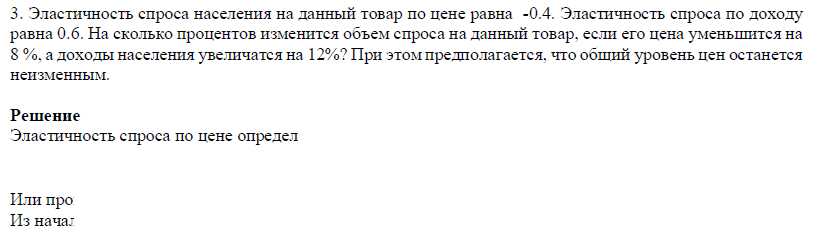 Эластичность спроса населения на данный товар по цене равна -0.4. Эластичность спроса по доходу равна 0.6. На сколько процентов изменится объем спроса на данный товар, если его цена уменьшится на 8 %, а доходы населения увеличатся на 12%? При этом предполагается, что общий уровень цен останется неизменным.