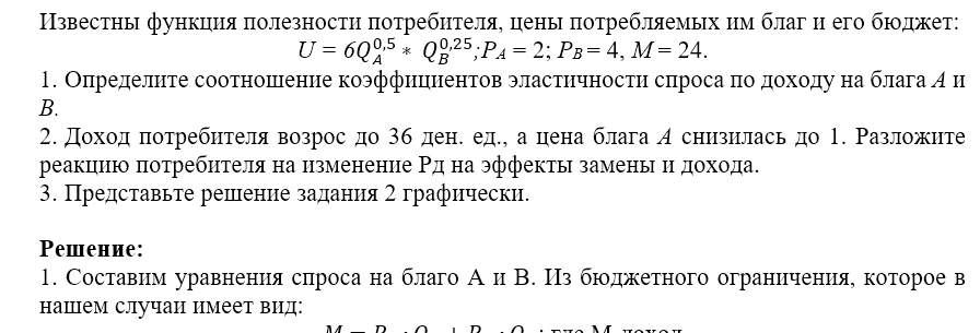 цифровой товар цифровой товар Задача 0166/21 (экономическая теория) 200 ₽ Оформление Выберите параметр Оформление PDF Добавить Добавить Описание Комментарии 0 Описание Условие задачи: Известны функция полезности потребителя, цены потребляемых им благ и его бюджет: Определите соотношение коэффициентов эластичности спроса по доходу на блага А и В. Доход потребителя возрос до 36 ден. ед., а цена блага А снизилась до 1. Разложите реакцию потребителя на изменение Рд на эффекты замены и дохода. Представьте решение задания 2 графически. Решение: Становится доступным после покупки! Комментарии 0 Добавить комментарий