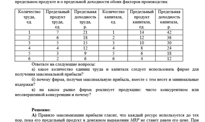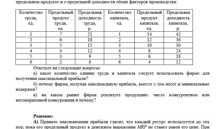 На конкурентном рынке приобретаются два переменных ресурса: труд и капитал. Цена единицы труда составляет 5 р., единицы капитала – 8 р. В таблице приведены данные о предельном продукте и о предельной доходности обоих факторов производства: