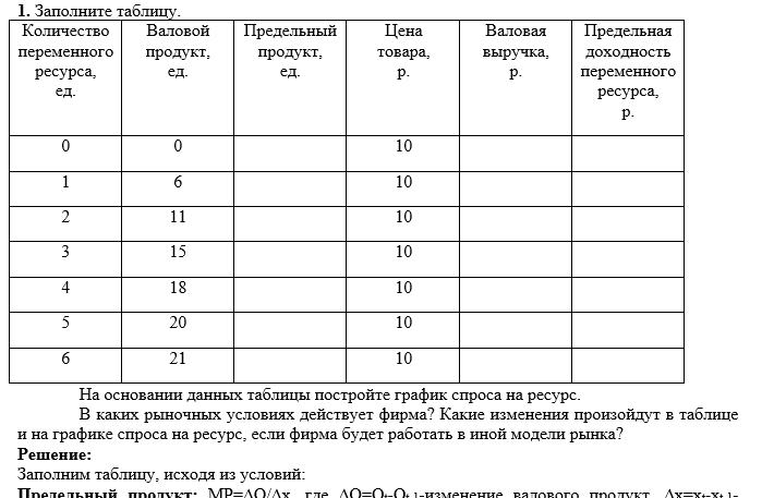 В каких рыночных условиях действует фирма? Какие изменения произойдут в таблице и на графике спроса на ресурс, если фирма будет работать в иной модели рынка?