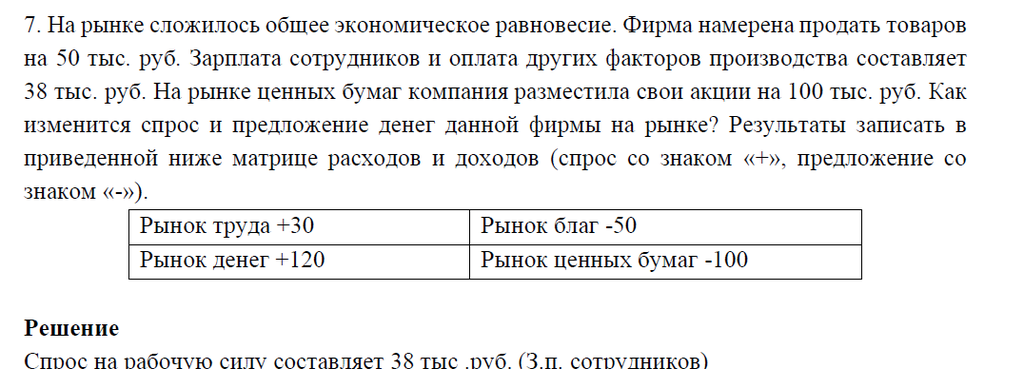 На рынке сложилось общее экономическое равновесие. Фирма намерена продать товаров на 50 тыс. руб. Зарплата сотрудников и оплата других факторов производства составляет 38 тыс. руб. На рынке ценных бумаг компания разместила свои акции на 100 тыс. руб. Как изменится спрос и предложение денег данной фирмы на рынке? Результаты записать в приведенной ниже матрице расходов и доходов (спрос со знаком «+», предложение со знаком «-»).