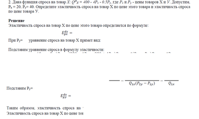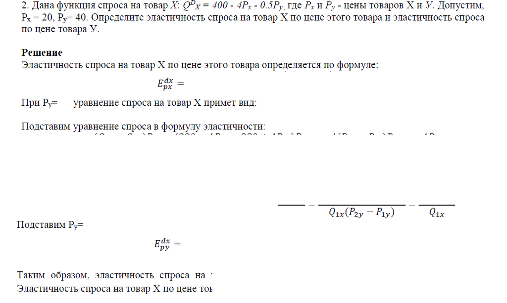 Дана функция спроса на товар X: Q^D * X = 400 - 4Px - 0.5Py , где Px и Py - цены товаров Х и У. Допустим, Px = 20, Py= 40. Определите эластичность спроса на товар Х по цене этого товара и эластичность спроса по цене товара У.