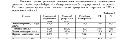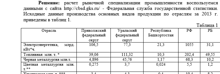 Определите отрасли рыночной специализации промышленности Приволжского федерального округа, Уральского федерального округа и Республики Башкортостан, используя таблицу (см. таблицу).