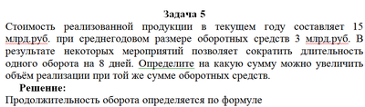 Стоимость реализованной продукции в текущем году составляет 15 млрд.руб. при среднегодовом размере оборотных средств 3 млрд.руб. В результате некоторых мероприятий позволяет сократить длительность одного оборота на 8 дней. Определите на какую сумму можно увеличить объём реализации при той же сумме оборотных средств.
