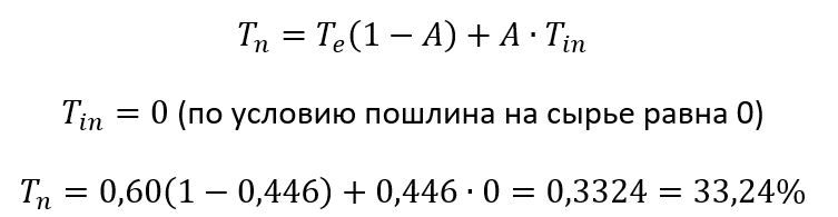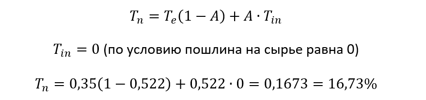 T_e- эффективный уровень таможенной защиты; T_n- номинальная ставка тарифа на конечную продукцию; T_in- номинальная ставка тарифа на импортированные части и компоненты; A - доля стоимости импортированных компонентов в стоимости конечного продукта.