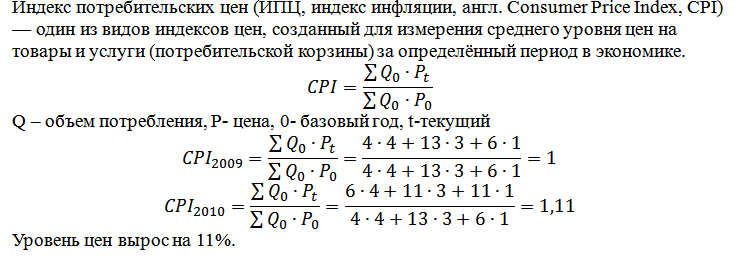 1. В экономике производится только три вида товаров: А, Б и В. Их цены в 2009 и 2010 гг. составляли соответственно: А - 4 ден.ед. и 6 ден.ед., Б - 13 ден.ед. и 11 ден.ед., В - 6 ден.ед. и 11 ден.ед. Объем потребления этих товаров был неизменен и составил: А-4, Б-3, В-1. Если 2009 г.- базовый, то уровень цен в 2010 г. по сравнению с 2009 г.