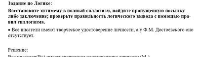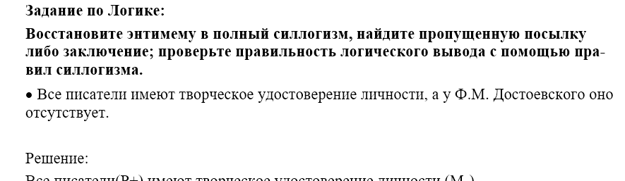 Восстановите энтимему в полный силлогизм, найдите пропущенную посылку либо заключение; проверьте правильность логического вывода с помощью правил силлогизма.